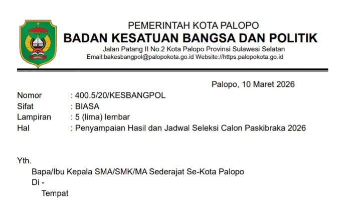 SABER, PALOPO | Badan Kesatuan Bangsa dan Politik Kota Palopo mengumumkan daftar peserta yang dinyatakan lolos seleksi administrasi calon Pasukan Pengibar Bendera Pusaka (Paskibraka) Kota Palopo Tahun 2026. Pengumuman tersebut disampaikan melalui surat resmi kepada seluruh SMA, SMK, dan MA sederajat di Palopo.