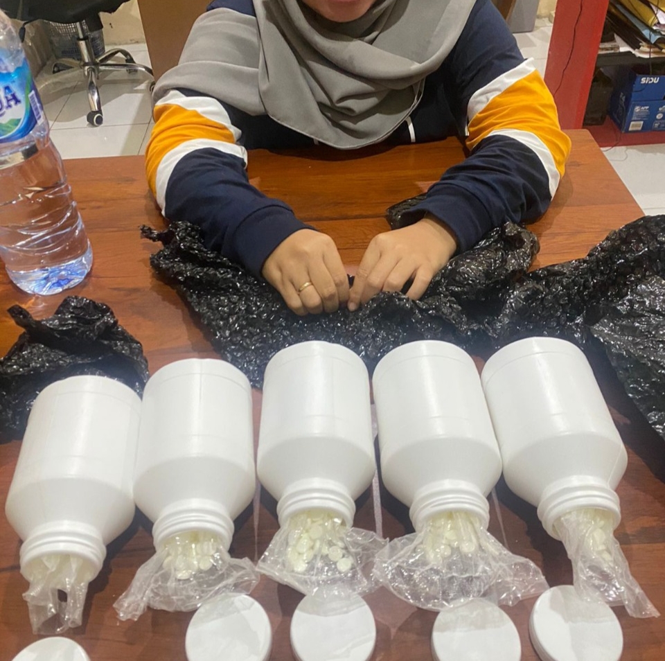 Selain pelaku, polisi juga mengamankan barang bukti berupa satu box berwarna cokelat, lima botol putih, 5000 butir pil obat jenis Trihexyphenidyl (THD) dan satu unit handpone merek OPPO warna hitam.