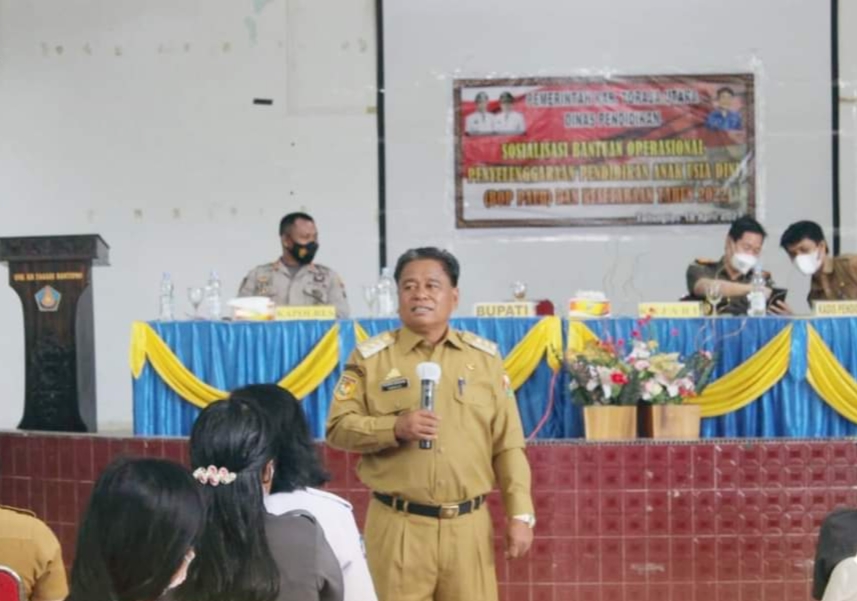 SABER, TORUT | Bupati Toraja Utara Yohanis Bassang, menghadiri sosialisasi bantuan operasional penyelenggaraan pendidikan anak usia dini (BOP PAUD) tahun 2022, bertempat di Aula SMK Kristen Tagari Tallunglipu. Selasa 19/04/2022.