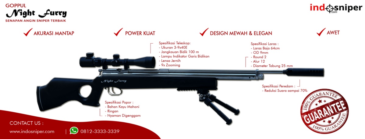 Dari segi harga memang lumayan terjangkau dan itu sangat sepadan dengan kualitasnya. Untuk informasi mengenai pembelian senapan angin pompa tangan Goppul – Night Furry, bisa melalui website https://www.indosniper.com atau langsung menghubungi WhatsApp /SMS 0812-3333-3339 Perusahaan Indosniper juga menyediakan cara pembelian melalui Tokopedia atau Bukalapak.