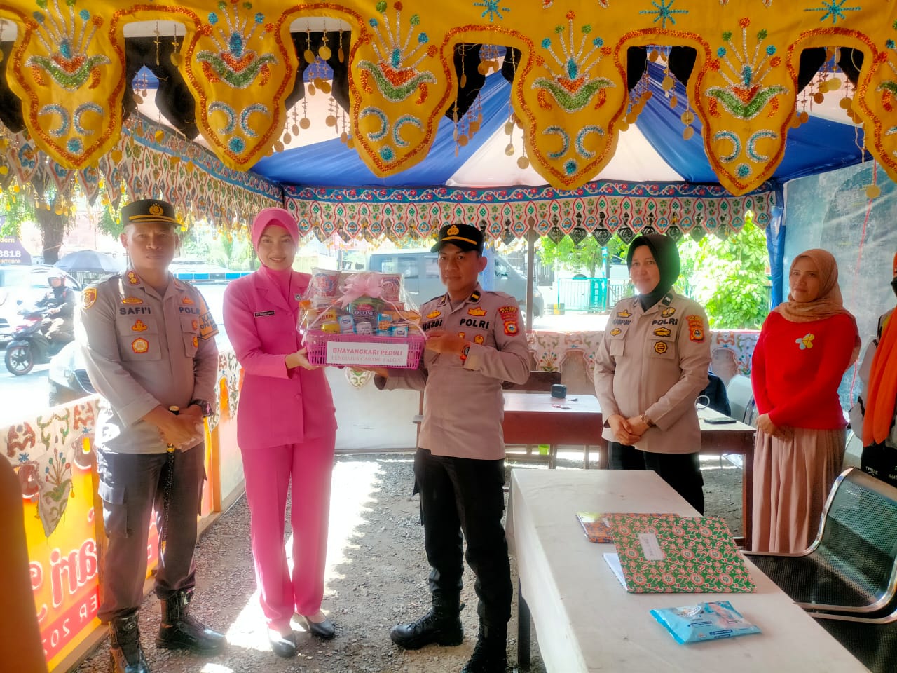 SABER, PALOPO | Kapolres Palopo, AKBP Safi’i Nafsikin bersama ketua dan pengurus bhayangkari cabang Palopo memberikan bingkisan kepada petugas pos pam City Market. Kamis (28/12/2023).