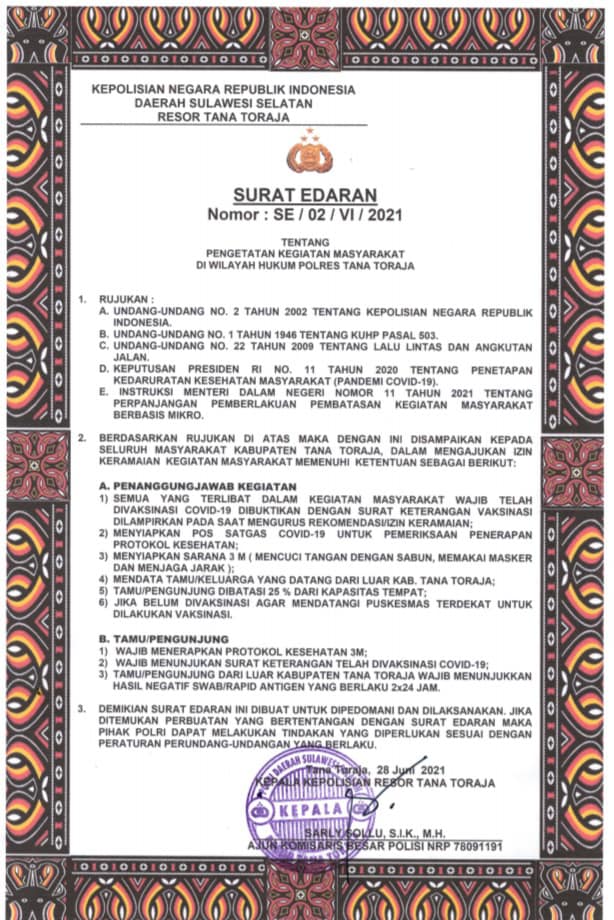 TATOR, SABER | Kapolres Tana Toraja, AKBP Sarly Sollu, SIK, MH, mengeluarkan Surat Edaran (SE) pengetatan kegiatan masyarakat di wilayah hukum Polres Tana Toraja. Senin, 28 Juni 2021.