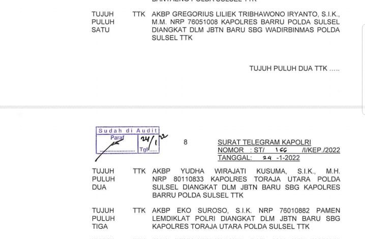 TORUT, SABER | Kepala Kepolisian Resort (Kapolres) Toraja Utara bergeser. Hal ini tertuang dalam surat telegram Kapolri Nomor: ST/166/I/KEP/2022 tanggal 24-1-2022, yang beredar di media sosial, Selasa (25/01/2022) malam.
