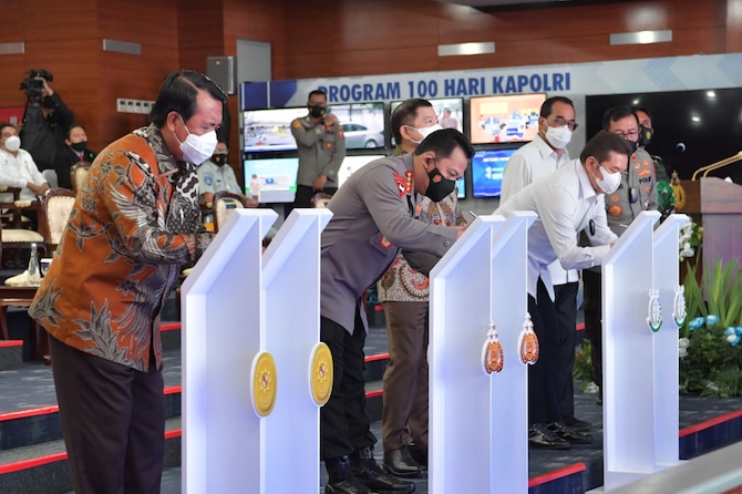 Launching Etle tahap 1 digelar di gedung NTMC Polri, Jakarta, Selasa (23/3/2021) yang dihadiri oleh Ketua Mahkamah Agung Muhammad Syarifuddin dan Jaksa Agung TB. Hassanudin turut dalam penandatangan Memorandum Of Understanding (MoU) penegakan hukum.