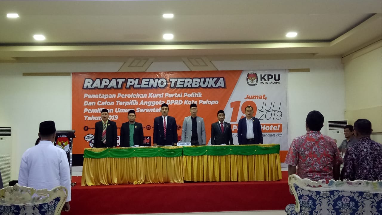 PALOPO, SATU BERITA | Sebanyak 25 calon anggota legislatif (caleg) terpilih di Pemilihan Umum (Pemilu) Legislatif 2019, resmi ditetapkan Komisi Pemilihan Umum (KPU) Palopo melalui rapat pleno terbuka yang digelar, Kamis (19/7/2019), di Palopo Hotel, Jalan Kelapa, Kota Palopo.