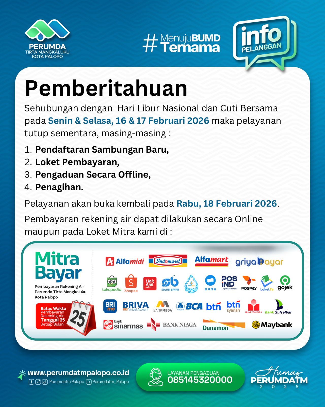 SABER, PALOP0 | Perumda Tirta Mangkaluku (TM) Kota Palopo mengumumkan penutupan sementara layanan operasional dalam rangka Hari Libur Nasional dan Cuti Bersama pada Senin dan Selasa, 16–17 Februari 2026. Kebijakan ini berdampak pada sejumlah layanan tatap muka yang untuk sementara tidak dapat diakses oleh pelanggan.