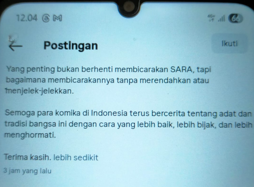 Ia berharap para komika Indonesia tetap dapat mengangkat tema budaya dan keberagaman dengan cara yang lebih bijak dan penuh rasa hormat.”tutupnya.(*)