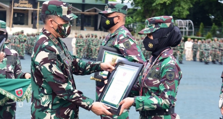 MAKASSAR, SABER | Usai pelaksanaan apel pagi, Pangdam XIV/Hasanuddin Mayjen TNI Mochamad Syafei Kasno, menyerahkan piagam penghargaan dan tali asih kepada prajurit Kodam Hasanuddin yang berprestasi bertempat di lapangan M. Yusuf Makodam, Jl. Urip Sumoharjo Makassar, Senin 8/11/2021.
