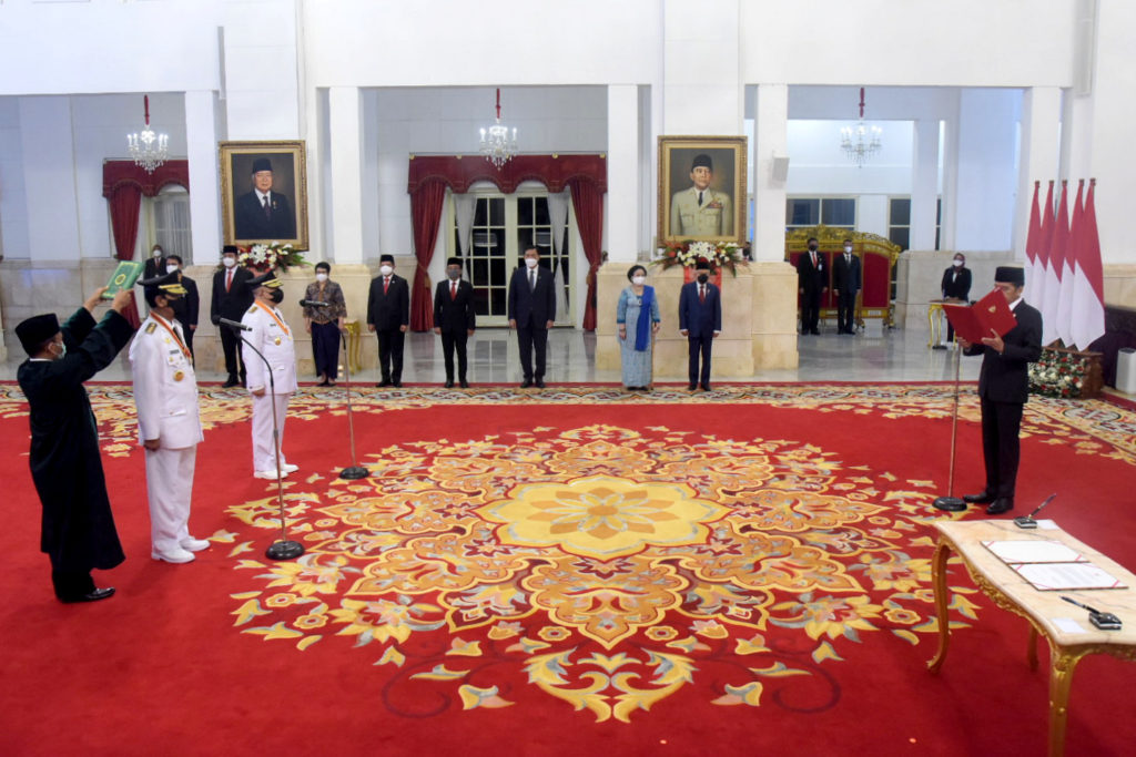 Sebelum pengambilan sumpah, Presiden Jokowi terlebih dahulu menyerahkan petikan Surat Keputusan Presiden kepada calon gubernur dan wakil gubernur di Ruang Kredensial, Istana Merdeka.