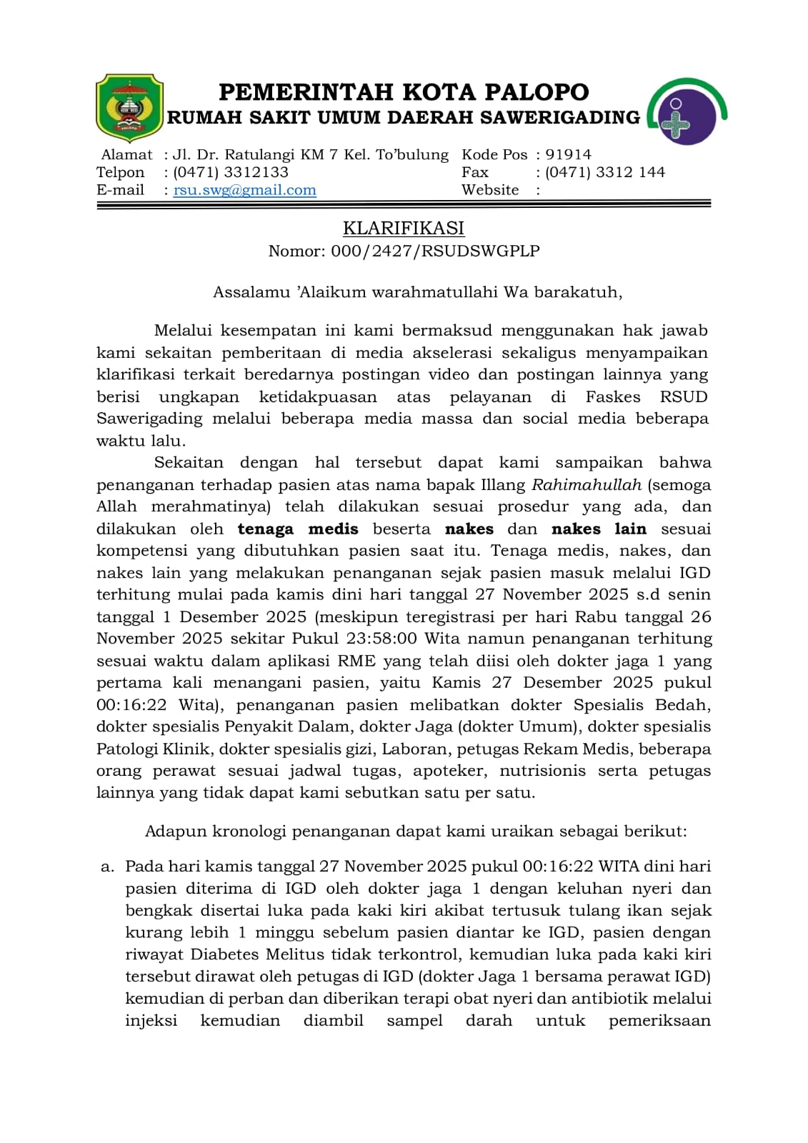SABER, PALOPO | Rumah Sakit Umum Daerah (RSUD) Sawerigading Palopo secara resmi menyampaikan klarifikasi tertulis atas pemberitaan yang berkembang terkait penanganan pasien almarhum Illang, yang wafat pada 1 Desember 2025.