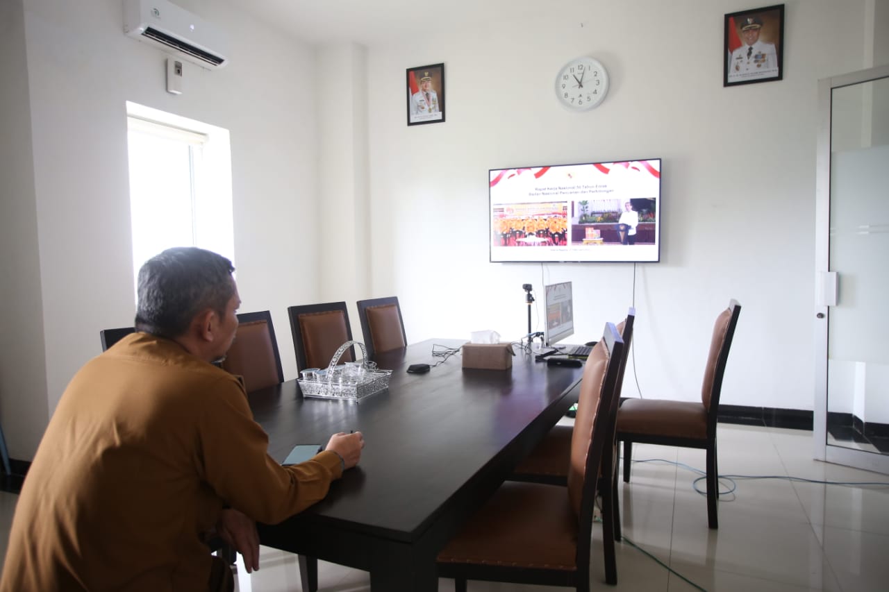 PALOPO, SABER | Sekretaris Daerah Kota Palopo, Firmanza DP mengikuti pembukaan Rakernas BASARNAS yang dibuka langsung oleh Presiden Republik Indonesia Secara virtual. Di ruangan Kepala Bappeda. Senin 21/02/2022.