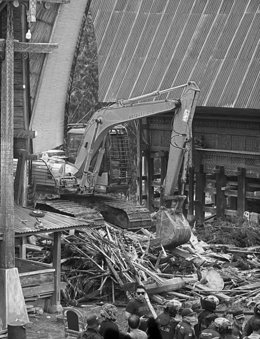 SABER, PALOPO | (OPINI). Jumat, 5 Desember 2025, menjadi hari kelam bagi masyarakat adat Toraja. Di Kelurahan Rante Kurra, Kecamatan Kurra, Kabupaten Tana Toraja, tiga rumah adat Tongkonan berusia ratusan tahun dan enam lumbung padi (alang) akhirnya rata dengan tanah. Ekskavator menggerus ukiran-ukiran suci, atap melengkung yang menjadi lambang kosmologi Alukta, serta tiang-tiang yang menyimpan memori leluhur.