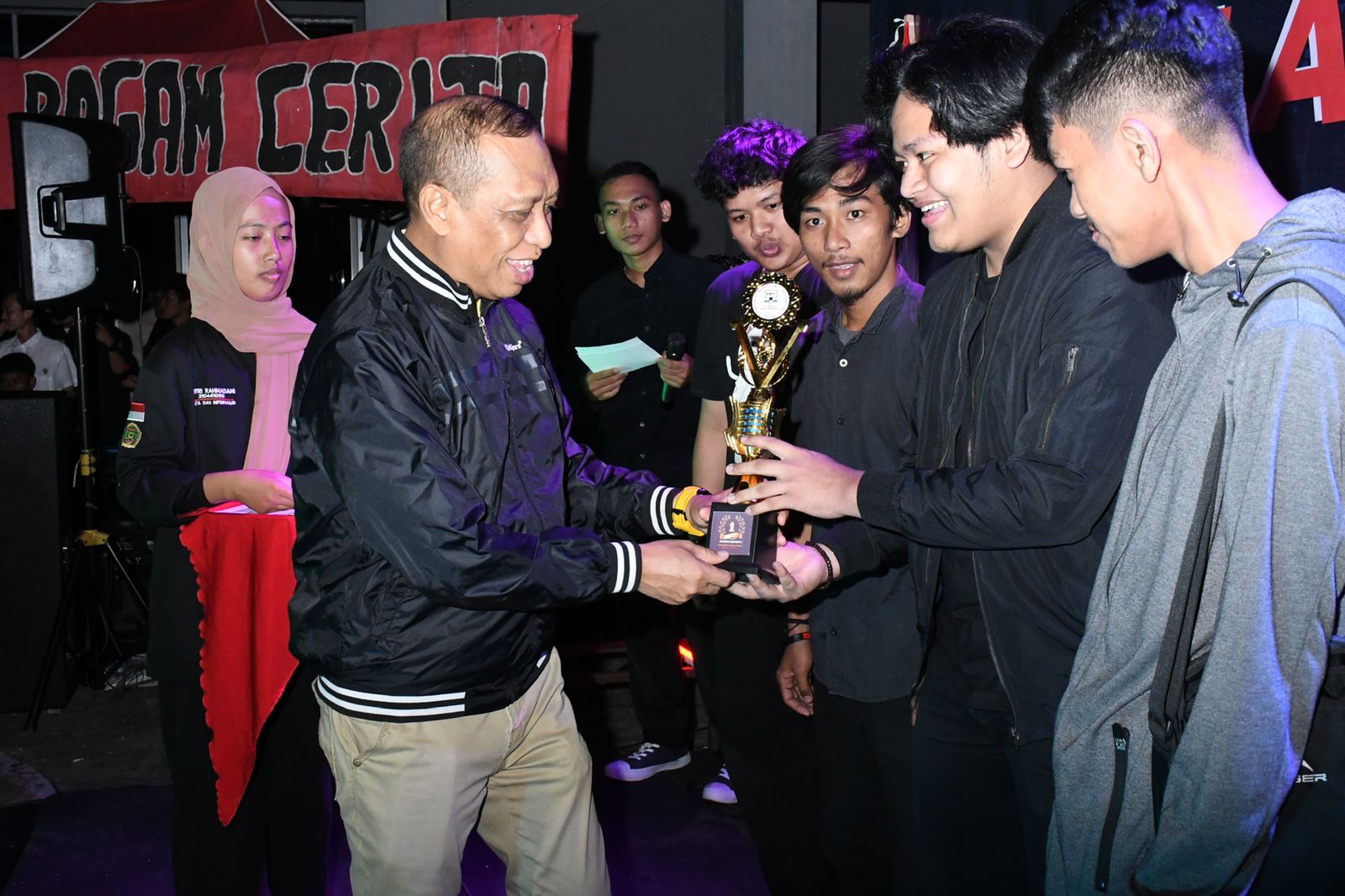 Rahmat Masri Bandaso memberikan sambutan untuk mahasiswa yang hadiri pada acra malam penutupan Event HMTI Event ini sangat memberikan semangat kepada mahasiswa-mahasiswa yang mempunyai bakat di kampus untuk di pertandingkan di kegiatan ini.