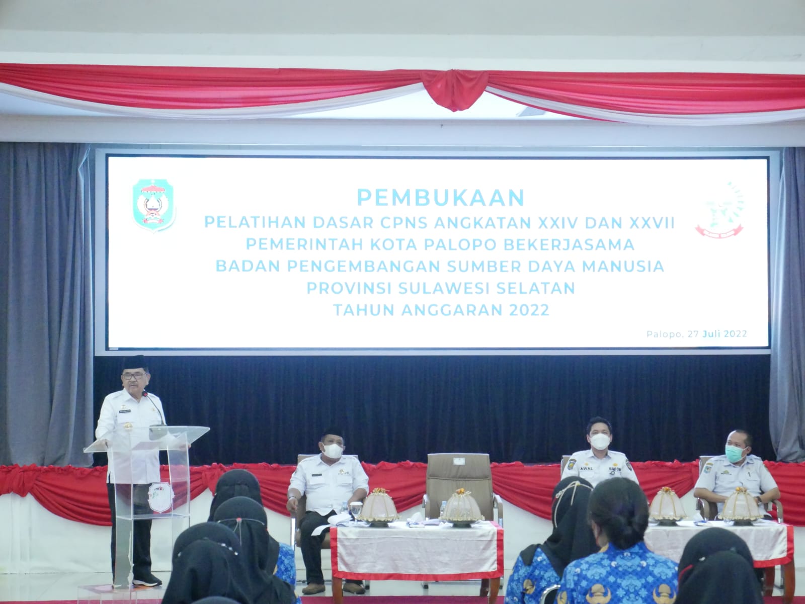 SABER, PALOPO | Wali Kota Palopo Judas Amir menghadiri Pembukaan Pelatihan Dasar CPNS Angkatan XXIV dan XXVII, Pemerintah Kota Palopo bekerjasama Badan Pengembangan Sumber Daya Manusia Provinsi Sulawesi Selatan, Tahun Anggaran 2022. Yang diselenggarakan di Ruang Pertemuan Ratona Kantor Walikota Palopo. Rabu, 27 Juli 2022.