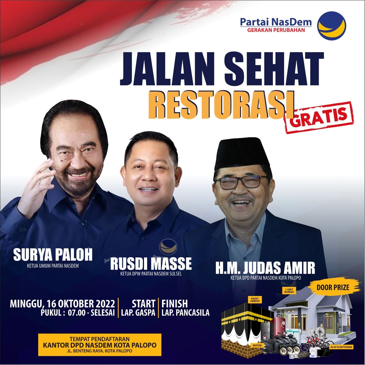 Tempat pendaftaran Kantor DPD Nasdem Kota Palopo, Jalan Benteng Raya. Adapun pendaftaran tidak dipungut biaya alias ‘GRATIS’.